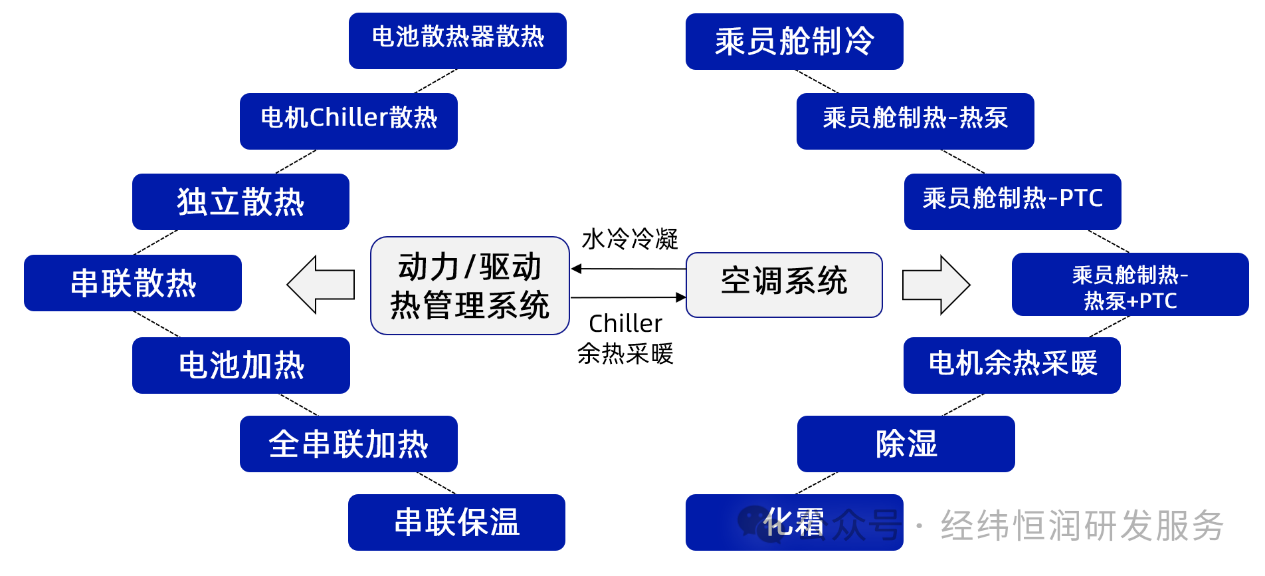 - 能量流动耦合:集成式热管理系统整合了各个子系统,回路间能量流动深度耦合。