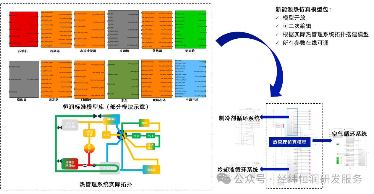 经纬恒润的整车热仿真标准模型库中提供了丰富的标准模块,可以根据不同热管理拓扑灵活构建系统模型。同时模型完全开放,支持用户进行二次开发。经纬恒润标准模型充分考虑了实时计算需求,用户无需额外进行复杂处理,即可轻松满足HIL系统所需的1ms仿真步长要求。