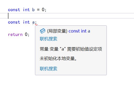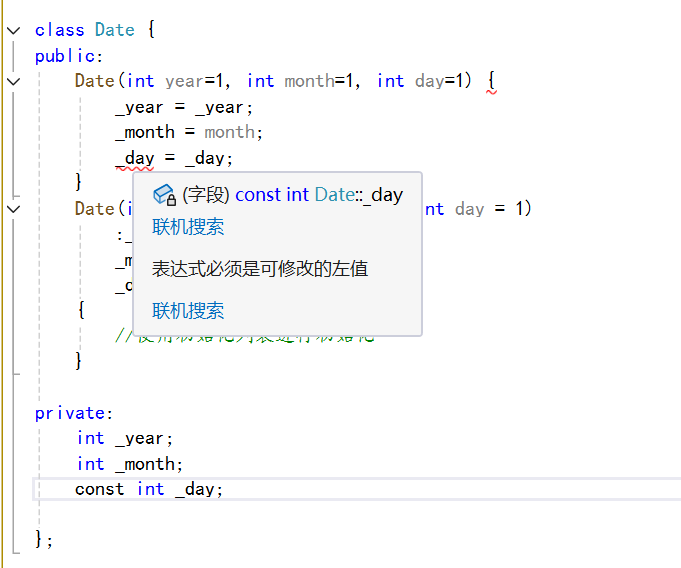 可以看到编译器对于const没有进行初始化的直接就报错了,那么要是我们的类中的成员变量要是有个变量被const的修饰的话,那么其也会有报错。