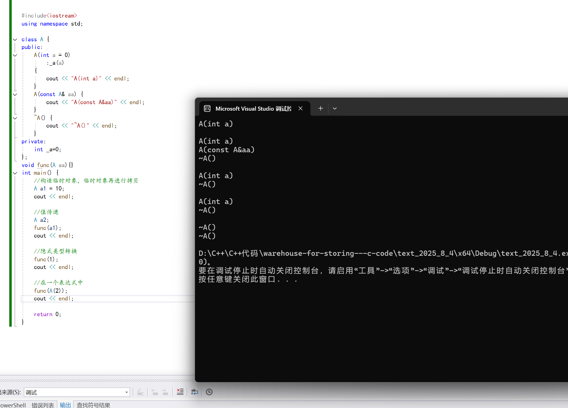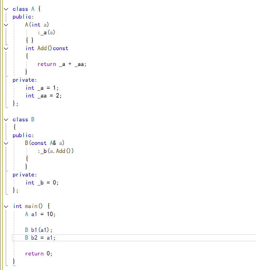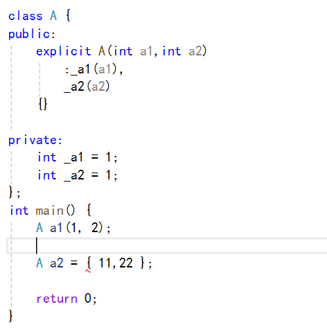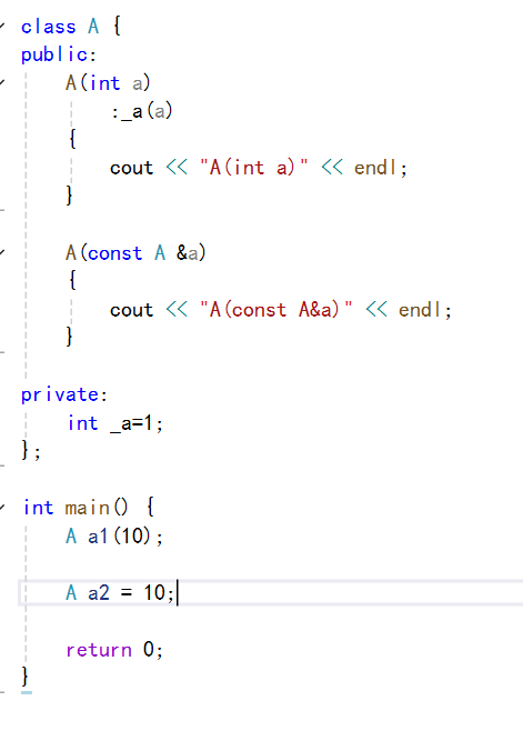 那么这个是咋样的呢?这个是隐式类型转换,其是基于我们的构造函数来写的,如果没有构造函数的话,就不能这么写,那么我们有了这个构造函数之后,它会先经过这个函数其构造一个临时对象,然后这个临时对象再通过拷贝构造给aa2。所以其基本过程就是先进行构造然后再进行拷贝构造,不过我们的编译器会有优化,直接变成构造。