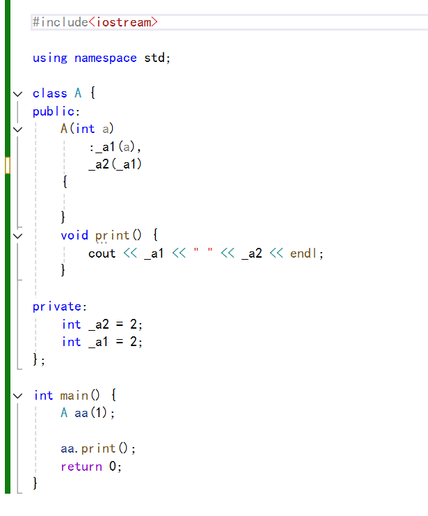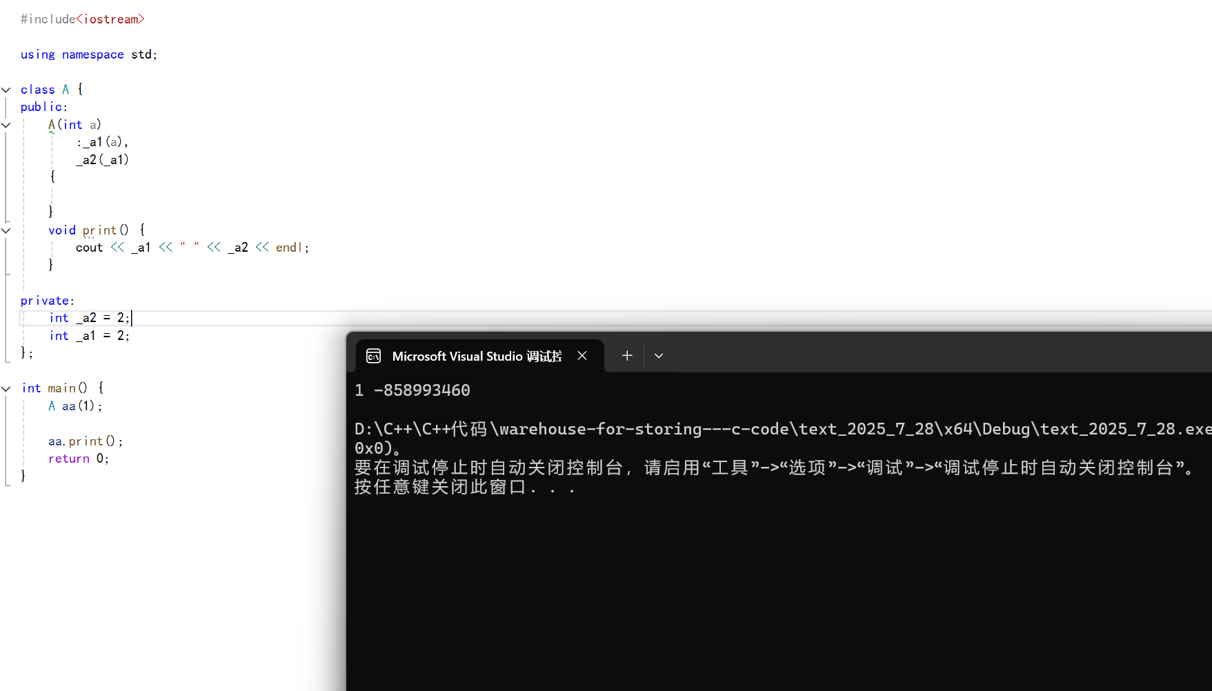 首先我们的类中有两个成员变量,而且其在我们的构造函数中的初始化列表都有显示,然后我们的成员变量在声明的时候都有缺省值,所以我们的这个缺省值就不用理。然后就是我们上面说到的我们的初始化是按照声明的顺序进行初始化的,所以在初始化的时候会先进行_a2(_a1),此时我们的_a1还没有初始化的,所以我们的_a2初始化的值应该是一个随机值,然后才到我们的_a1进行初始化,所以_a1是1,然后_a2是一个随机值。