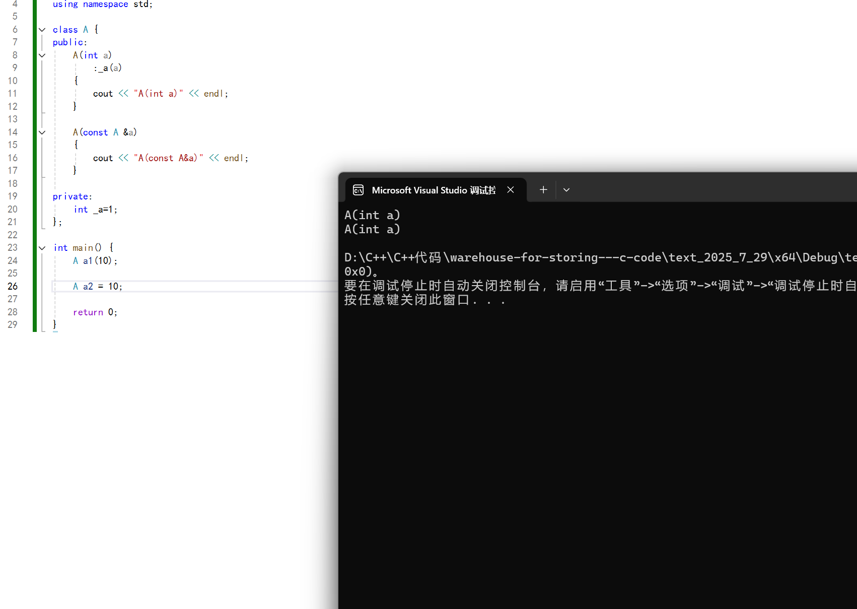 可以看到我们的编译器优化后,隐式类型转换是没有经过拷贝构造的,这是我们的编译器进行优化的结果,并不是其没有经过拷贝构造,对于一些编译器是没有这个优化的。