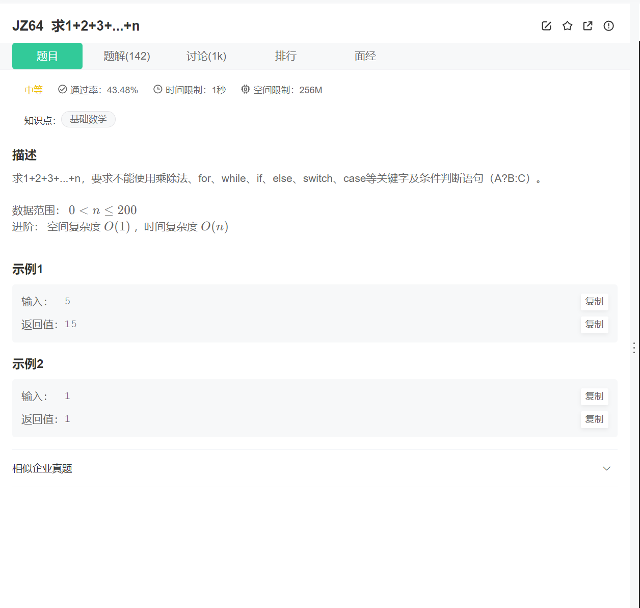 题目链接:求1+2+3+...+n_⽜客题霸_⽜客⽹
