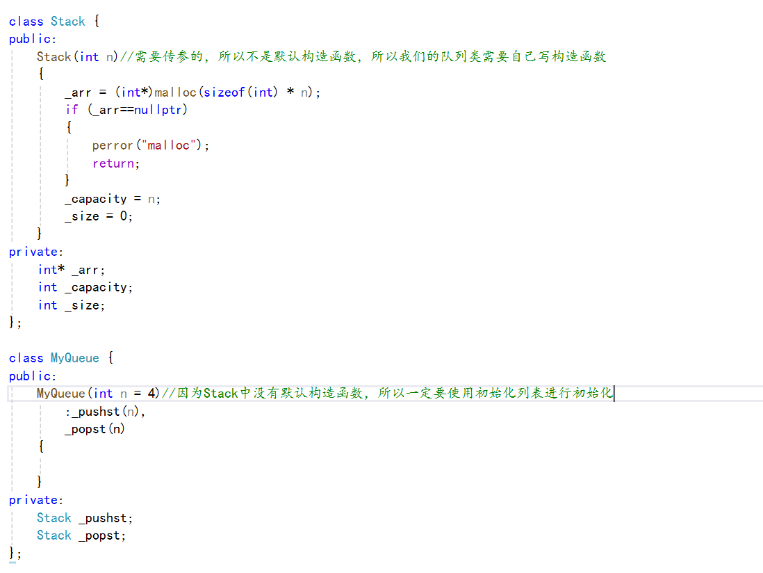 前面我们讲到使用栈实现队列的类的时候,我们讲到队列类中的成员变量是也是自定义类型的,对队列初始化的时候我们没有显示的实现构造函数,那么其就会去调用栈中的构造函数。不过要注意的是要是栈中没有默认构造函数,那么我们就需要在队列中去写构造函数。