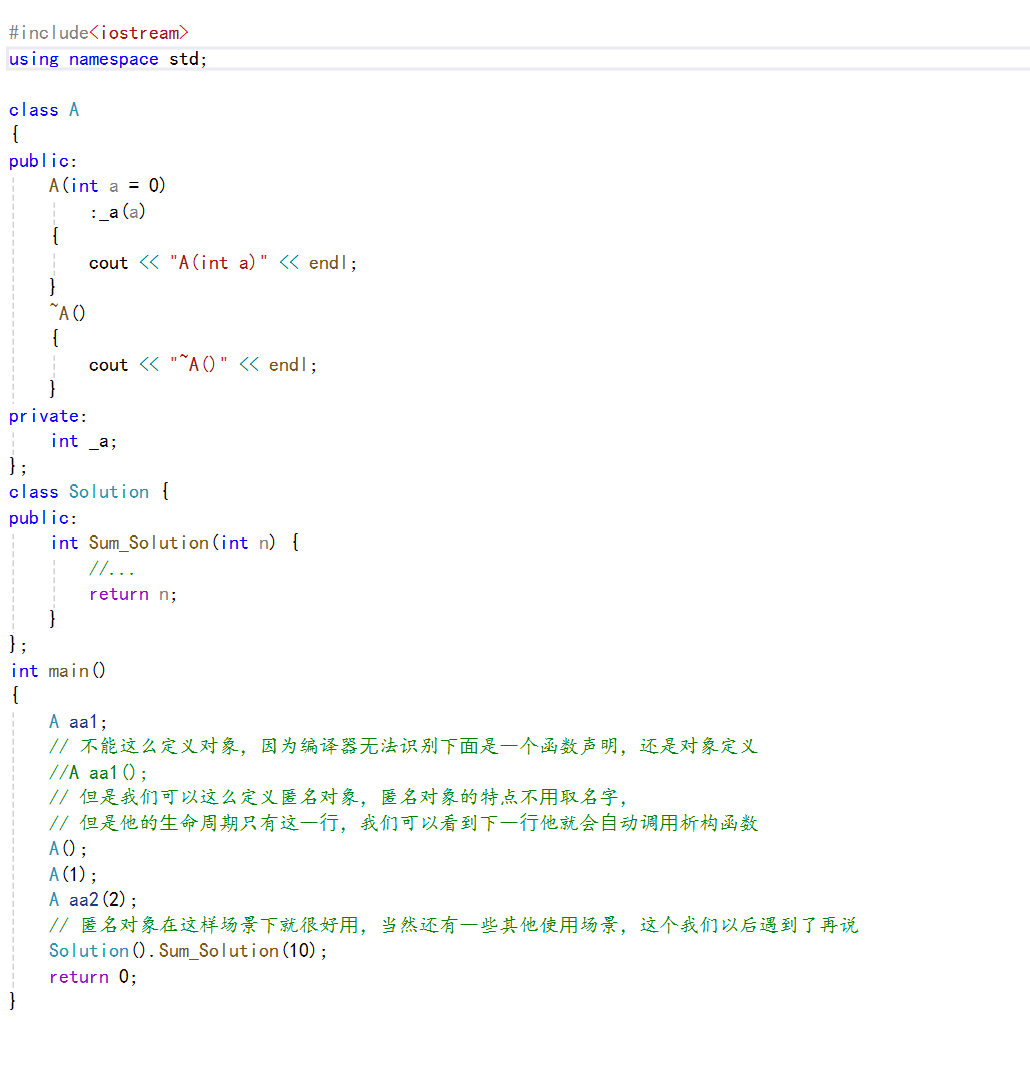 在前面,我们用类型+对象名(实参)的对象我们称为有名对象,在某些编程过程中,编译器自己产生的临时的对象叫临时对象,而我们用的类型(实参)定义出来的对象叫做匿名对象。