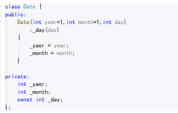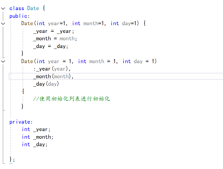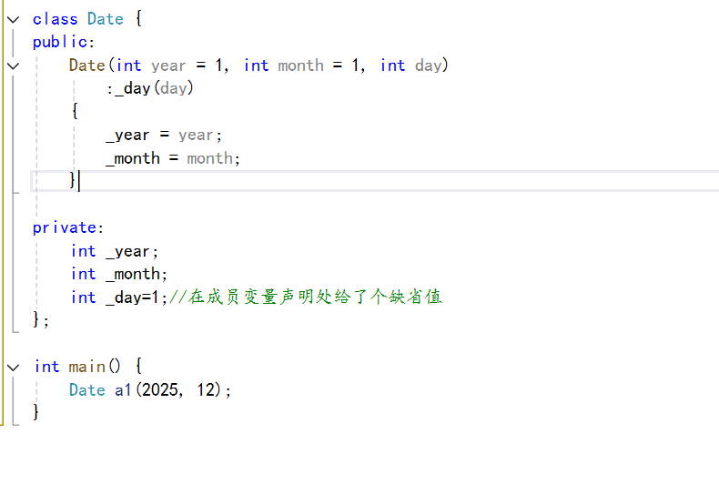 可以看到我们上面的Date类中,我们在成员变量声明中给day给了缺省值,所以我们在构造函数中,我们不传参的话就会使用这个缺省值 ,要注意的是这个缺省值是给初始化列表使用的。