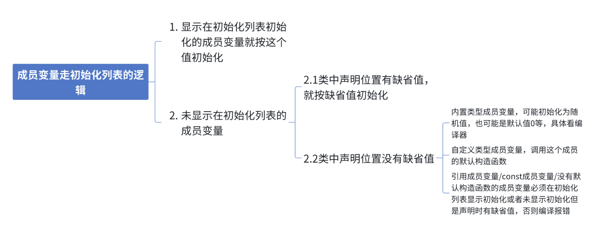 4、尽量使用初始化列表进行初始化,这是因为那些我们不在初始化列表初始化的成员其会走初始化列表,如果这个成员在声明的位置给了缺省值,那么初始化列表会用这个缺省值初始化,如果没有给缺省值,对于没有显示的在初始化列表初始化的内置类型是否初始化取决于编译器,C++中并没有显示的在初始化列表初始化的自定义类型成员会调用这个成员类型的默认构造函数,如果没有的话就会造成编译错误。