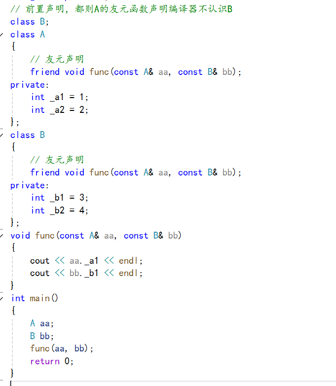 对于第四点要注意,我们要是在类A中声明了一个友元函数,然后这个友元函数其声明中,参数即有类A又有类B,而且类A在类B的前面,那么我们在类A的前面就要加上类B的声明,这是因为要是没有这个声明的话,编译器走到这个友元函数的声明的时候不认识这个类B。