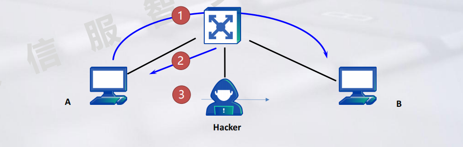 Hacker冒充B持续发送ARP Reply给A(此时,A会以为接收到的MAC地址是B的,但是