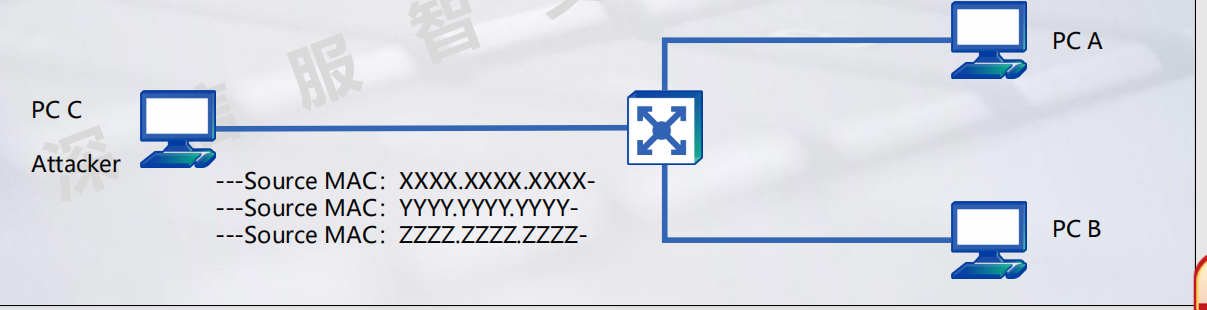 • 泛洪攻击即是攻击者利用这种学习机制不断发送不同的MAC地址给交换机,填满整个
