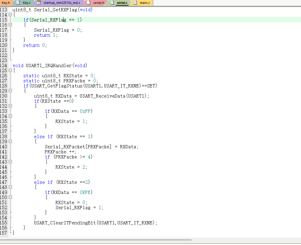 等待帧头 0xFF → 接收4字节数据 → 等待帧尾 0xFE → 置位 Serial_RXFlag (通知主程序)。