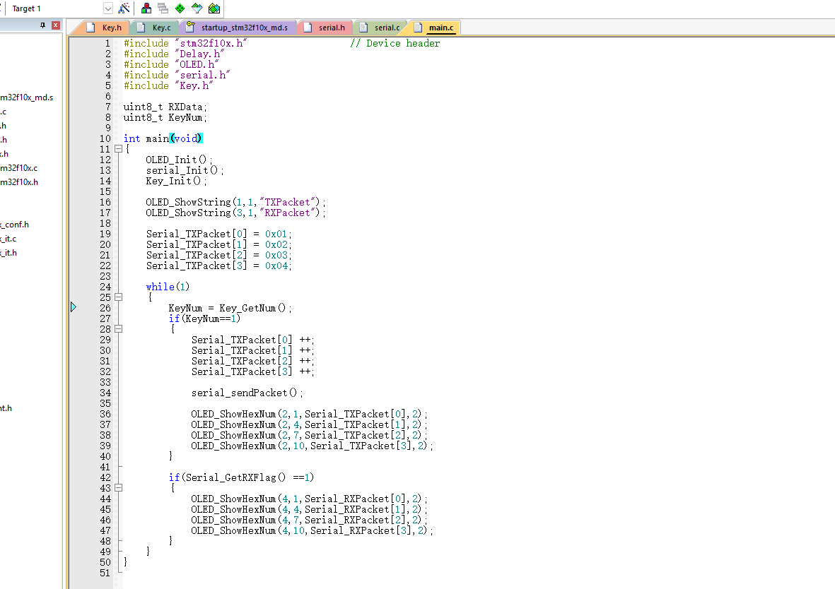 实现主逻辑,通过按键触发发送数据包,接收数据后在OLED上显示收发内容。