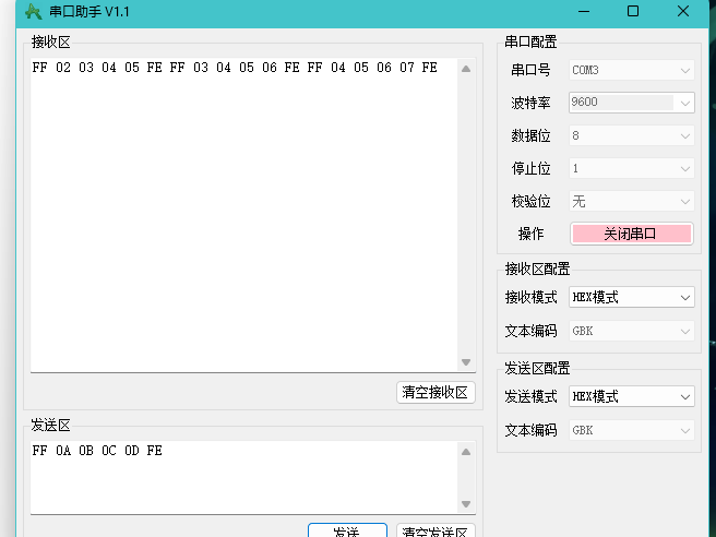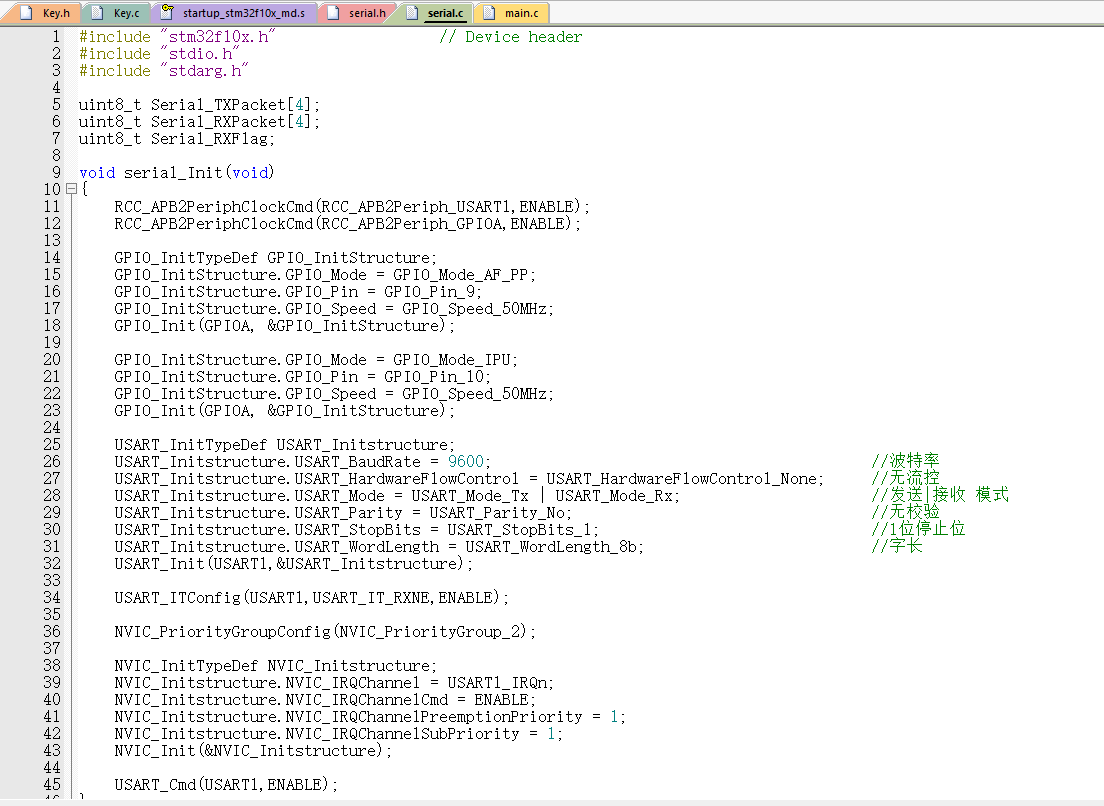 串口参数:波特率9600、8位数据位、1位停止位、无校验、无流控,同时使能收发模式。