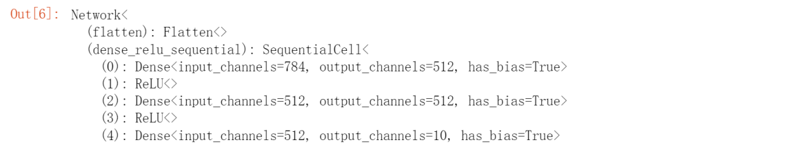 class Network(nn.Cell):def __init__(self):super().__init__()self.flatten = nn.Flatten()self.dense_relu_sequential = nn.SequentialCell(nn.Dense(28*28, 512),nn.ReLU(),nn.Dense(512, 512),nn.ReLU(),nn.Dense(512, 10))def construct(self, x):x = self.flatten(x)logits = self.dense_relu_sequential(x)return logitsnet = Network()