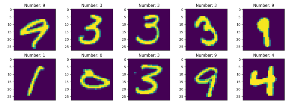 for i in range(1,11):plt.subplot(2, 5, i)plt.imshow(np.squeeze(images[i]))plt.title('Number: %s' % labels[i])plt.xticks([])