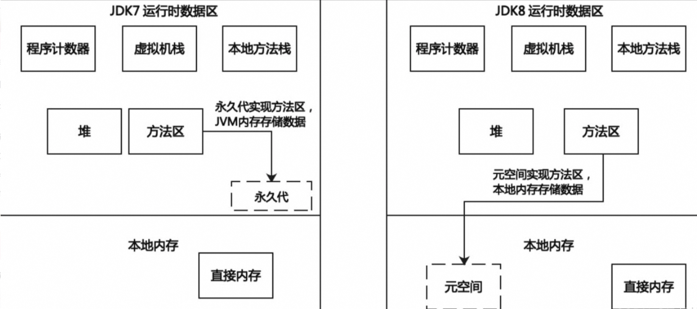JDK 8使用元空间实现方法区,元空间中的数据放在了本地内存当中,直接内存和元空间一样都属于堆外内存。