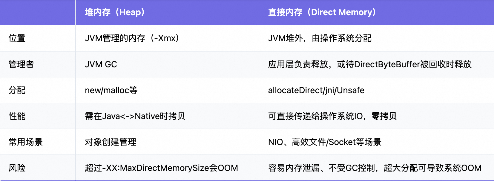 import java.nio.ByteBuffer;public class DirectMemoryExample {public static void main(String[] args) {// 分配一块100字节的直接内存ByteBuffer directBuffer = ByteBuffer.allocateDirect(100);// 写入数据directBuffer.put((byte) 0x01);directBuffer.put((byte) 0x02);// 翻转位置,准备读取directBuffer.flip();// 读取数据while (directBuffer.hasRemaining()) {byte b = directBuffer.get();System.out.println(b); // 输出1、2}// 不需要像关闭stream那样显示释放,JVM会在DirectByteBuffer回收时自动释放native内存// 但如果大量直接内存频繁分配,有可能因JVM回收不及时导致OOM}
