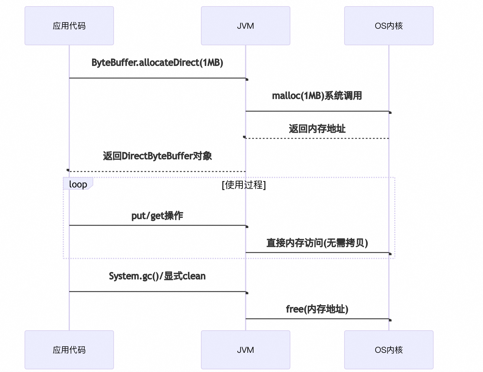 ByteBuffer.allocateDirect(int capacity)这会分配一块操作系统本地内存,然后返回一个Java层提供封装的DirectByteBuffer对象用以操作。