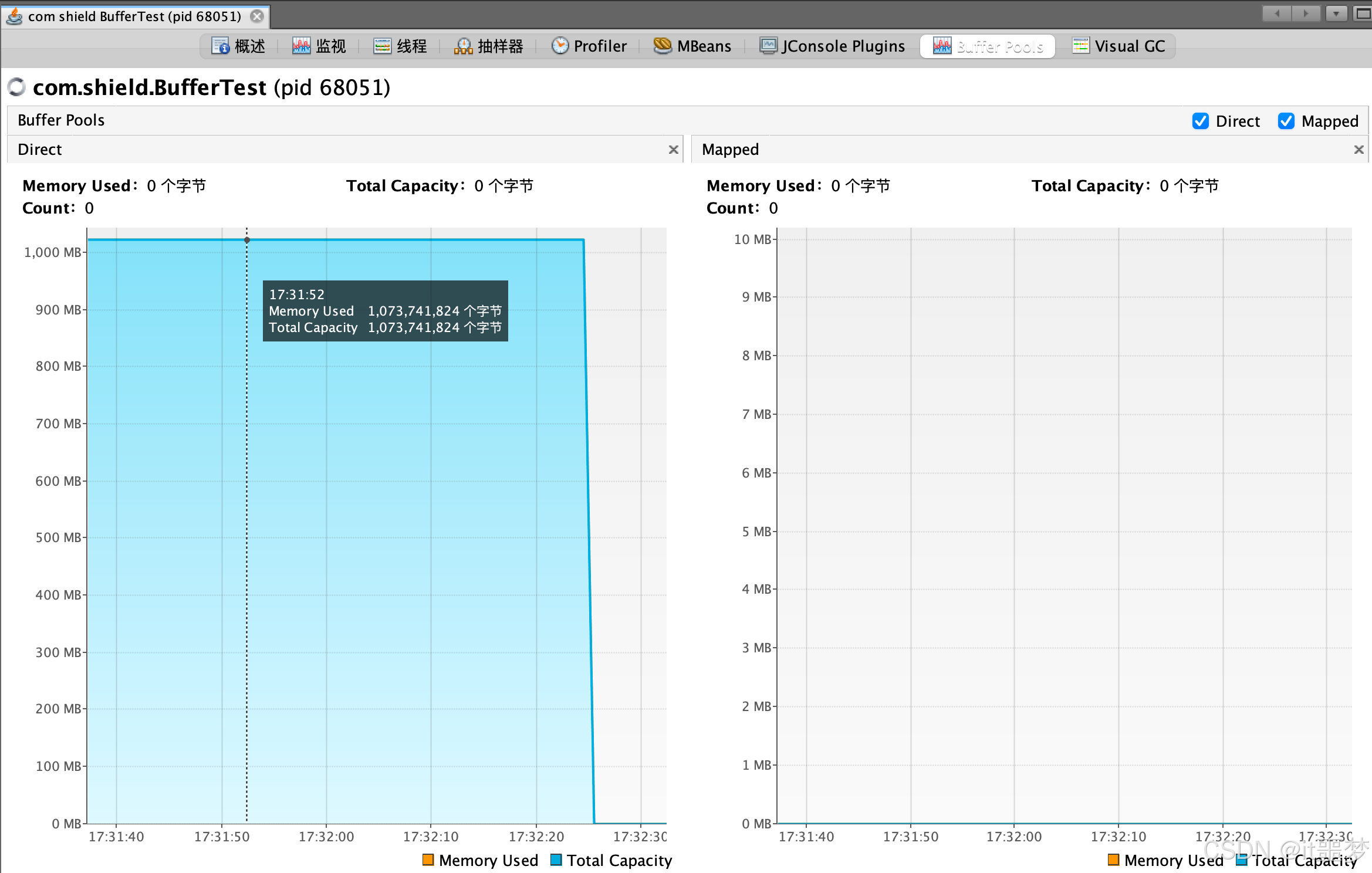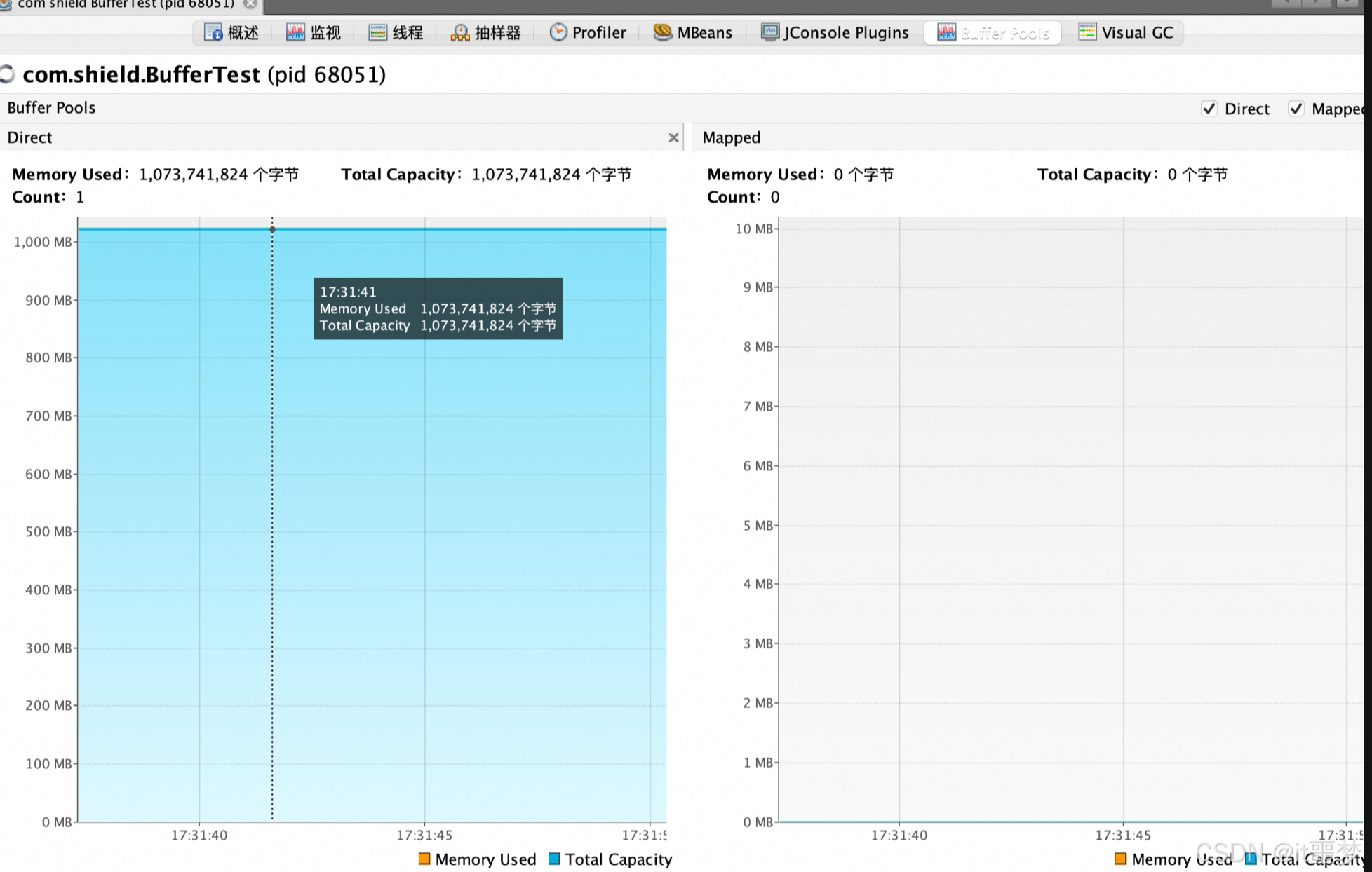 import java.util.Scanner;public class BufferTest {private static final int BUFFER = 1024 * 1024 * 1024;//1GBpublic static void main(String[] args) {//直接分配本地内存空间ByteBuffer byteBuffer = ByteBuffer.allocateDirect(BUFFER);System.out.println("直接内存分配完毕,请求指示!");Scanner scanner = new Scanner(System.in);scanner.next();System.out.println("直接内存开始释放!");byteBuffer = null;System.gc();scanner.next();}
