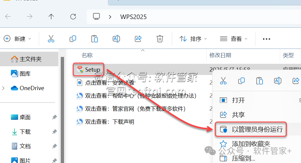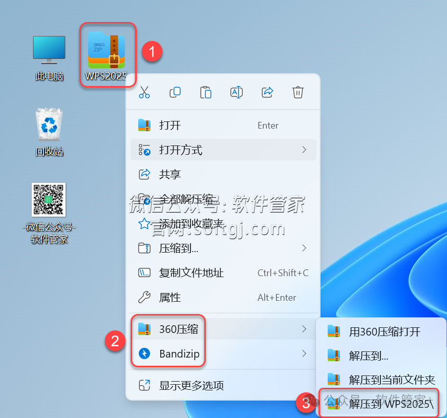 1.解压安装包:①鼠标右击【WPS2025】压缩包②选择电脑上安装的解压软件(如:360压缩)③点击【解压到WPS2025】。