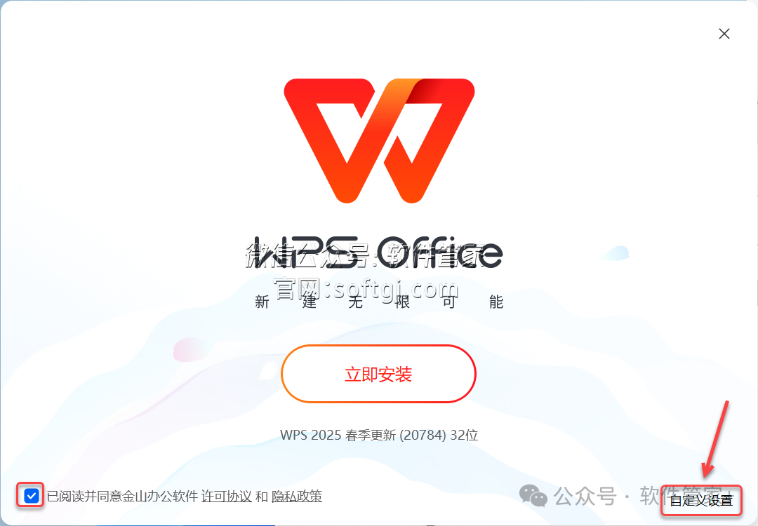 3.勾选【已阅读并同意……】,点击【自定义设置】。