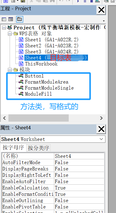 在VBE中编写VBA代码,在目标表(sheet4)中写主程序