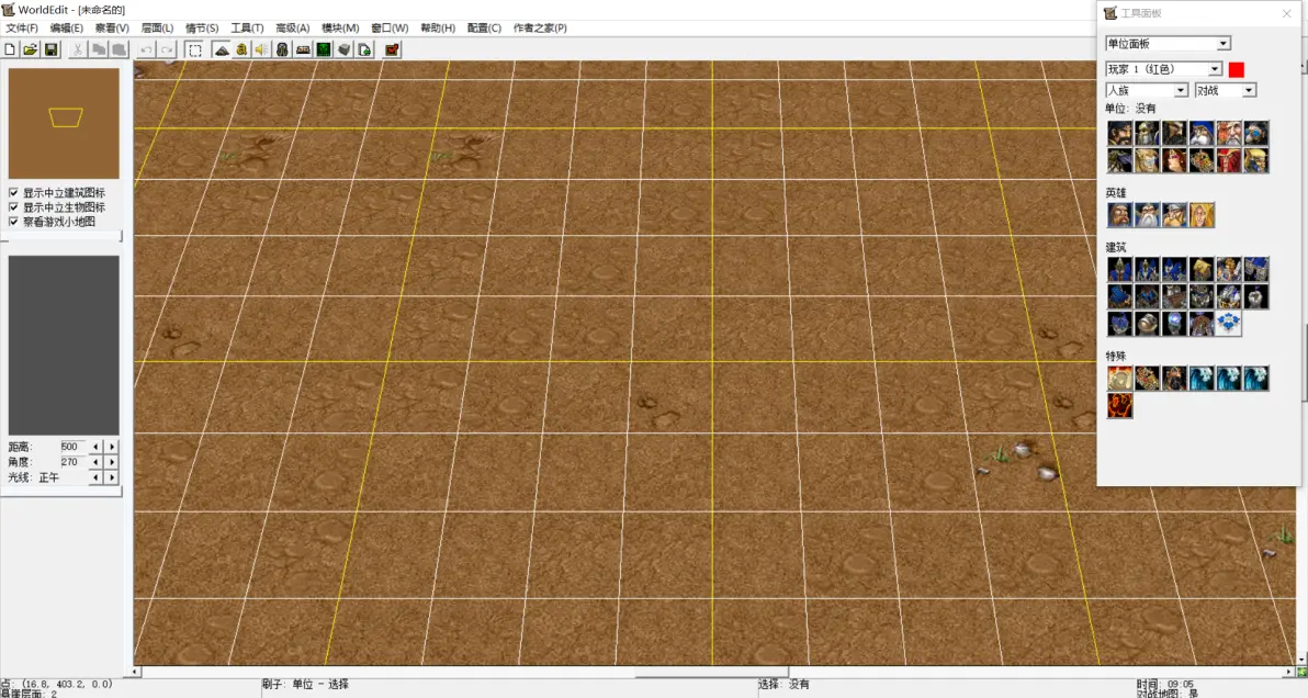 在首次打开地图编辑器之后,会进入下面这个界面,图中的棕色部分其实就是魔兽里泥土的样子,这是因为首次进入编辑器时会默认创建一个全是泥土的空白地图。