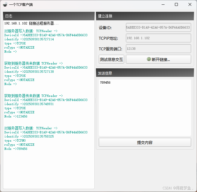 {QString identify=QDateTime::currentDateTime().toString("yyyyMMddhhmmsszzz");TcpHeader header;memset(&header, 0, sizeof(TcpHeader));memcpy(header.TcpDeviceId, DriveID.toUtf8().constData(), 37);header.TcpDeviceId[36] = '\0';memcpy(header.Timestamp, identify.toUtf8().constData(), 18);header.Timestamp[17] = '\0';header.reType = TCPOK;header.type = type;QByteArray packet(reinterpret_cast<const char*>(&header), sizeof(TcpHeader));//将发送区文本发送给客户端const QByteArray send_data = data.toUtf8();packet.append(send_data);TcpClient->write(packet);emit q_ptr->SendMess(QString("对服务器写入数据: TCPHeader -> <br/>""DeviceId ->%1 <br/> ""identify ->%2 <br/> ""type ->%3 <br/> ""reType ->%4 <br/> ""Node ->%5 <br/> ").arg(QString::fromUtf8(QByteArray(header.TcpDeviceId))).arg(QString::fromUtf8(QByteArray(header.Timestamp))).arg(TN(header.type)).arg(TD(header.reType)).arg(data), TCPOK);