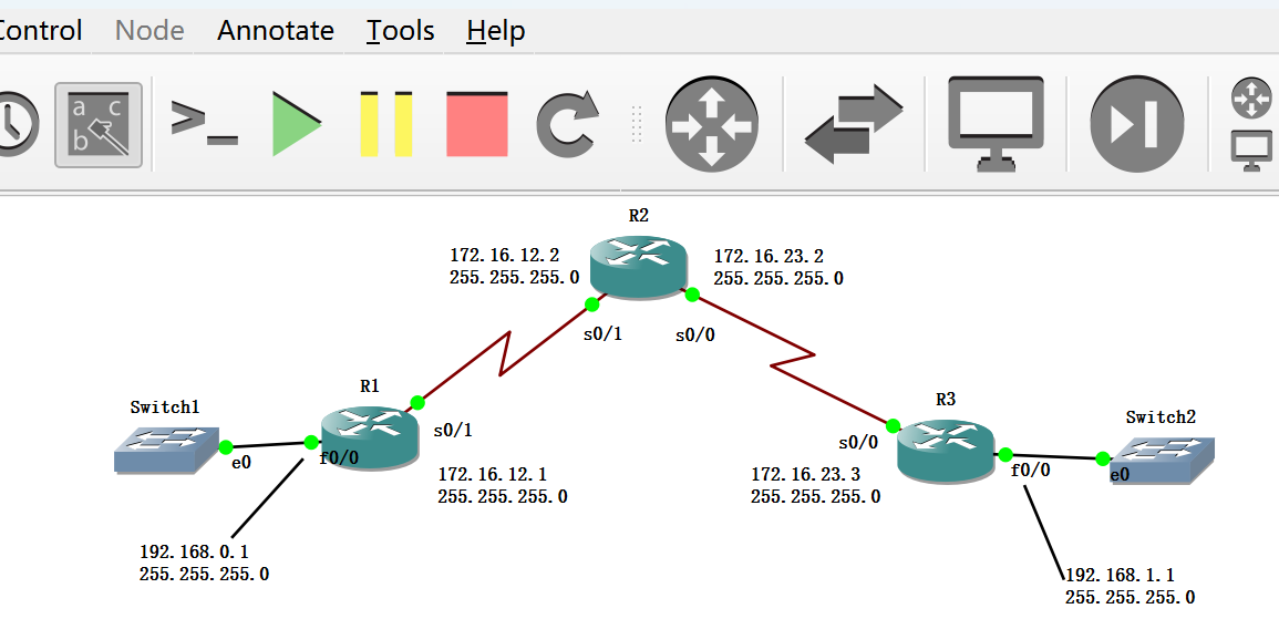 R2(config)#int s0/1 R2(config-if)#ip add 172.16.12.2 255.255.255.0 R2(config-if)#no shut R2(config-if)#int s0/0 R2(config-if)#ip add 172.16.23.2 255.255.255.0 R2(config-if)#no shut