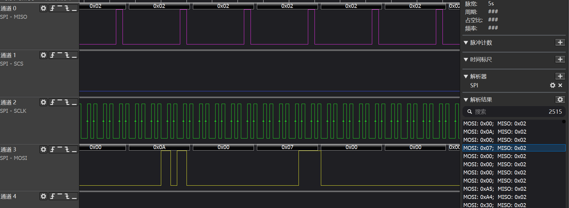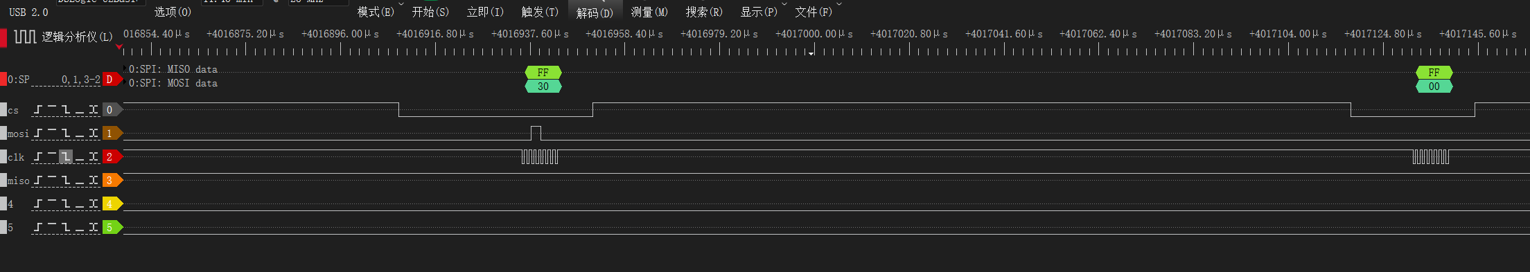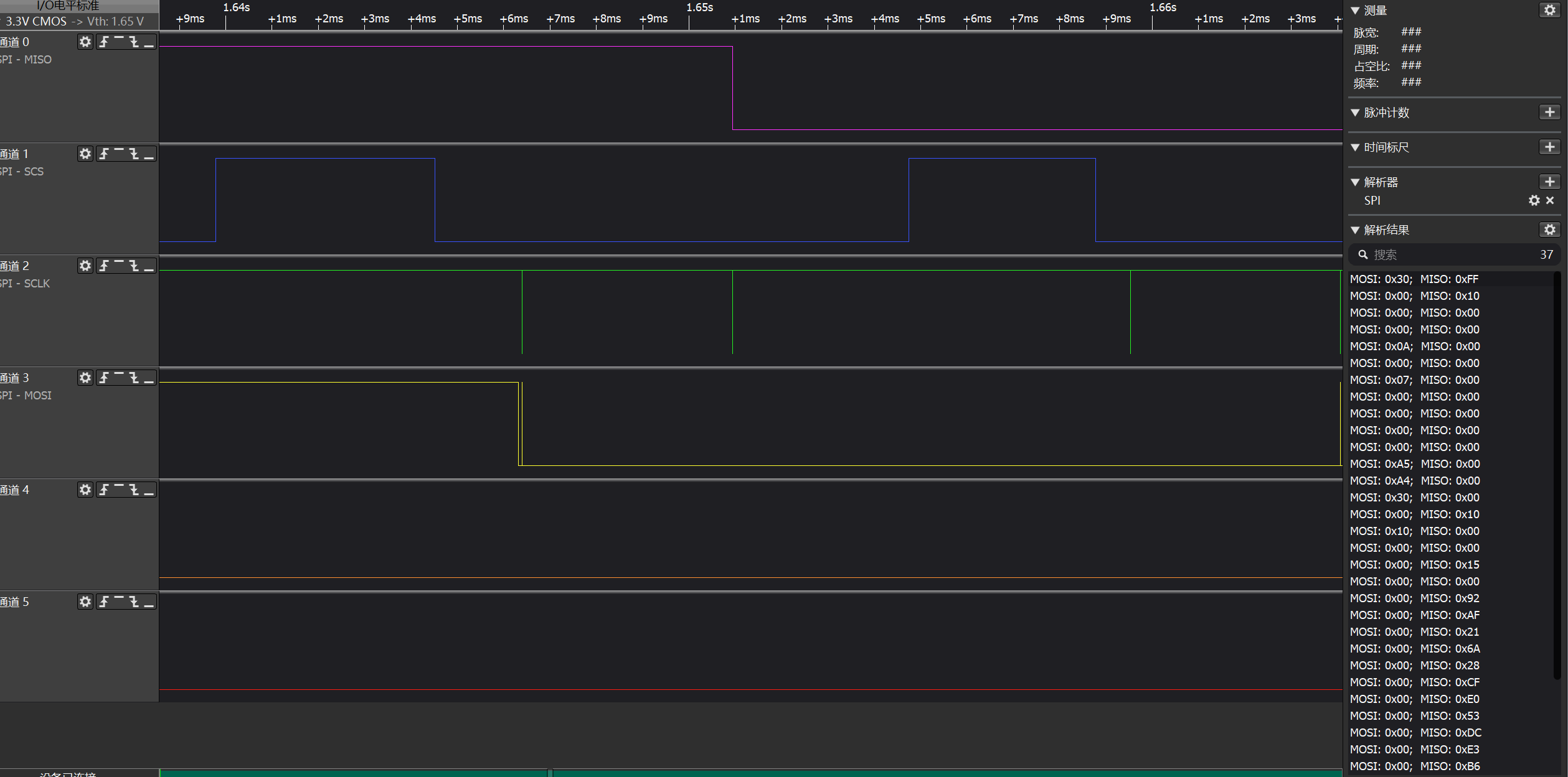 但是miso没反馈,实际上也没波形;所以确定主控支持的时钟频率;和设备支持的时钟频率---是否匹配;然后做全双工的回环测试,是ok的,证明主机功能正常