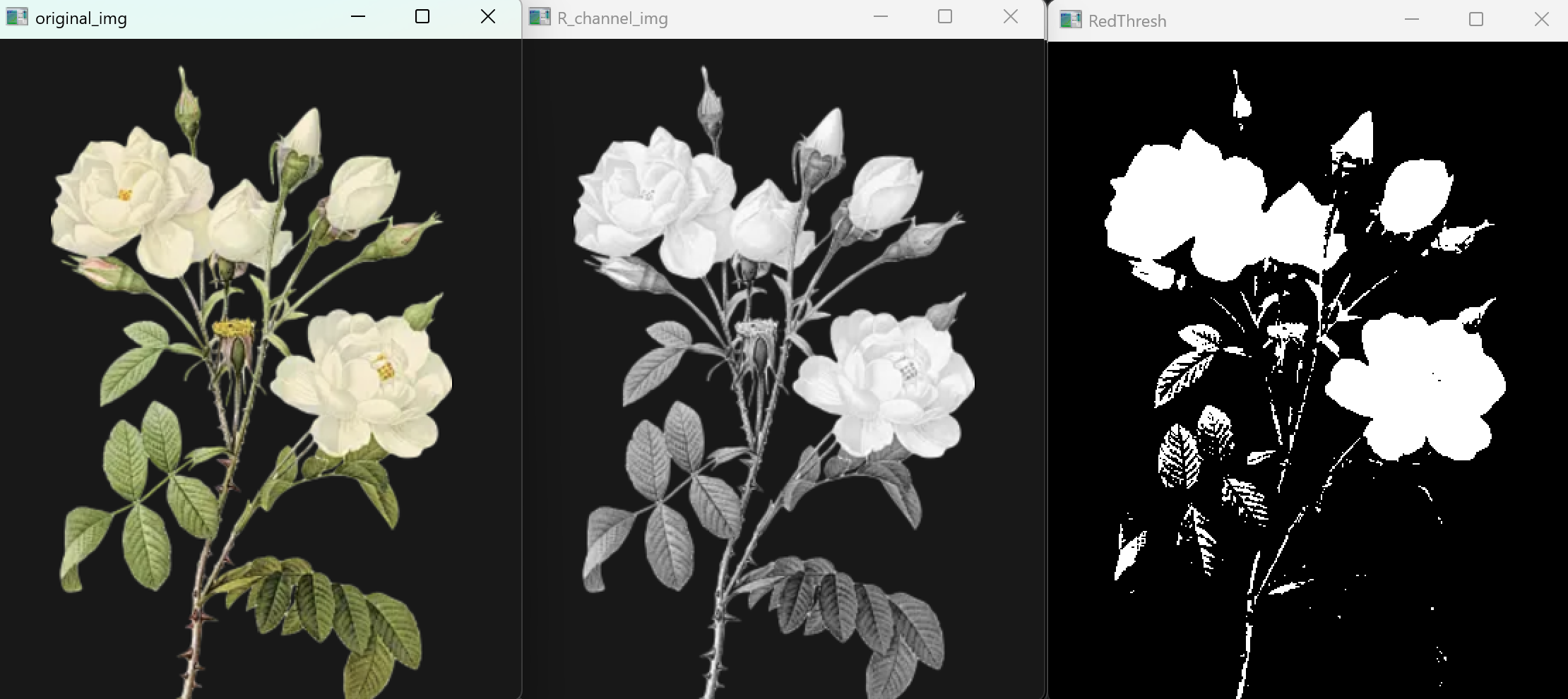 ),因为花朵的红色特征可能更明显,便于后续分离。 - 使用阈值函数