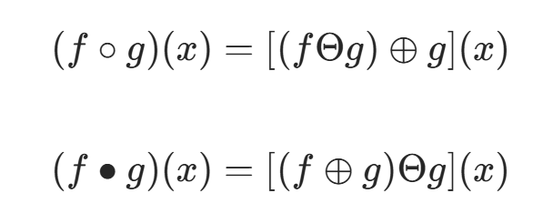 假设f(x)和g(x)为被定义在二维离散空间F和两个离散函数上,其中,f(x)为输入图像,g(x)为结构元素,则f(x)关于g(x)的腐蚀和膨胀分别定义为: