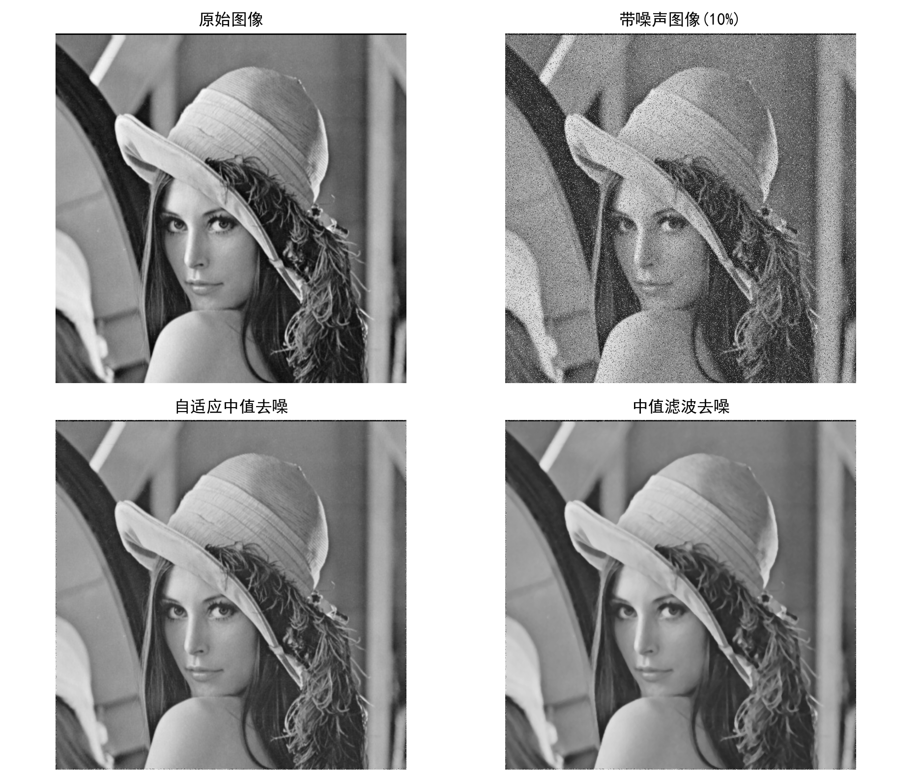 def main():try:# 读取图像original = plt.imread("lena.png")# 转换为灰度图(如果是3通道图像)if len(original.shape) == 3:# 先将0~1的float灰度映射到0~255,再转为uint8gray_float = np.dot(original[..., :3], [0.299, 0.587, 0.114])original = (gray_float * 255).astype(np.uint8)# 检查图像是否有效if original.ndim != 2:raise ValueError("图像转换后不是二维数组,请检查图像文件")rows, cols = original.shapeif rows < 7 or cols < 7:raise ValueError("图像尺寸太小,请使用更大的图像")# 添加噪声和去噪处理(使用比例添加噪声,更直观)original_noise = pepperNoise(0.1, original) # 添加10%的椒盐噪声adapMedianDeNoise = adaptiveMedianDeNoise(7, original_noise)mediDeNoise = medianDeNoise(original_noise)# 显示结果plt.figure(figsize=(10, 8))show(original, "原始图像", 2, 2, 1)show(original_noise, "带噪声图像(10%)", 2, 2, 2)show(adapMedianDeNoise, "自适应中值去噪", 2, 2, 3)show(mediDeNoise, "中值滤波去噪", 2, 2, 4)plt.tight_layout()plt.show()except FileNotFoundError:print("错误:找不到图像文件,请检查文件路径是否正确")except Exception as e:print(f"发生错误:{str(e)}")if __name__ == "__main__":main()