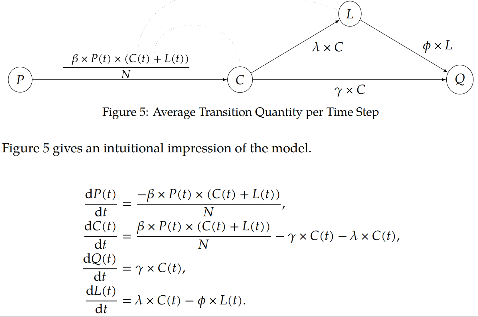 基于经典的SIR传染病模型进行改进,提出了PCQL模型。四类人群&四种系数。