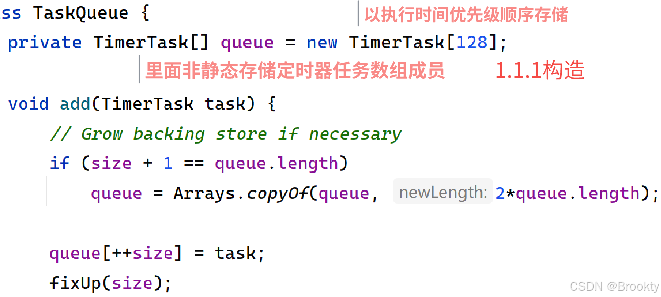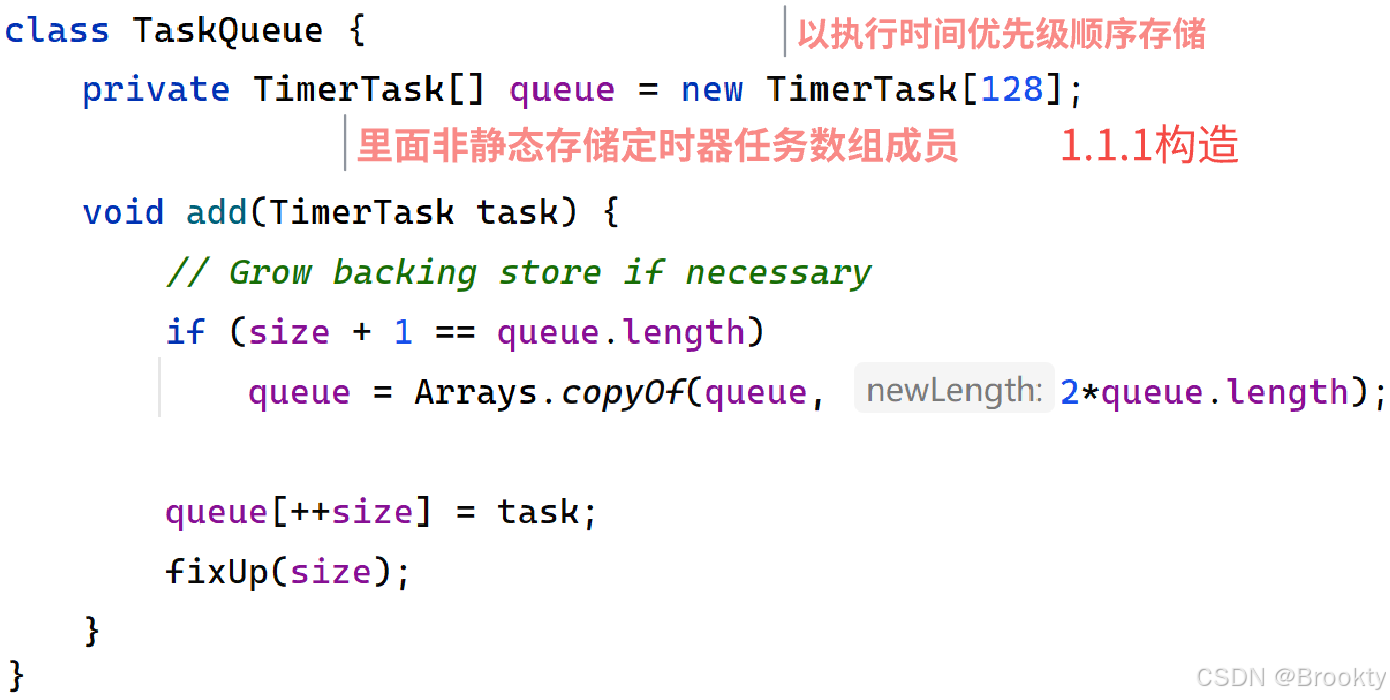 创建一个 里面非静态存储 以执行时刻优先级顺序 存储定时器任务的 TimerTask数组 的任务队列TaskQueue
