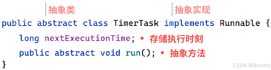 定时器任务TimerTask 抽象类 抽象实现 Runnable可运行接口,里面非静态成员nextExcutionTime预期执行时间 存储该任务执行的时刻