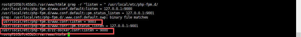 这里看到以.conf结尾的文件有两个一个www.conf,一个是zz-docker.conf,zz-docker.conf文件中监听了9000端口,我们把这个也修改一下试试。