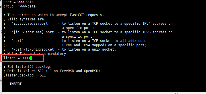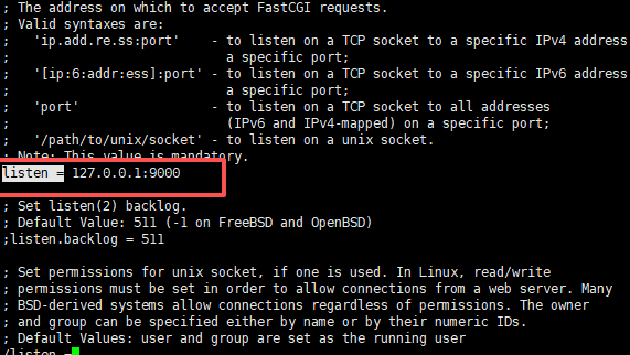 这里可以看到文件 中是 listen = 127.0.0.1:9000,按照匹配规则,肯定是修改不掉这部分的,所以,我们先临时修改一下(即:进入www.conf文件,修改内容 为 listen = 9003 保存退出)