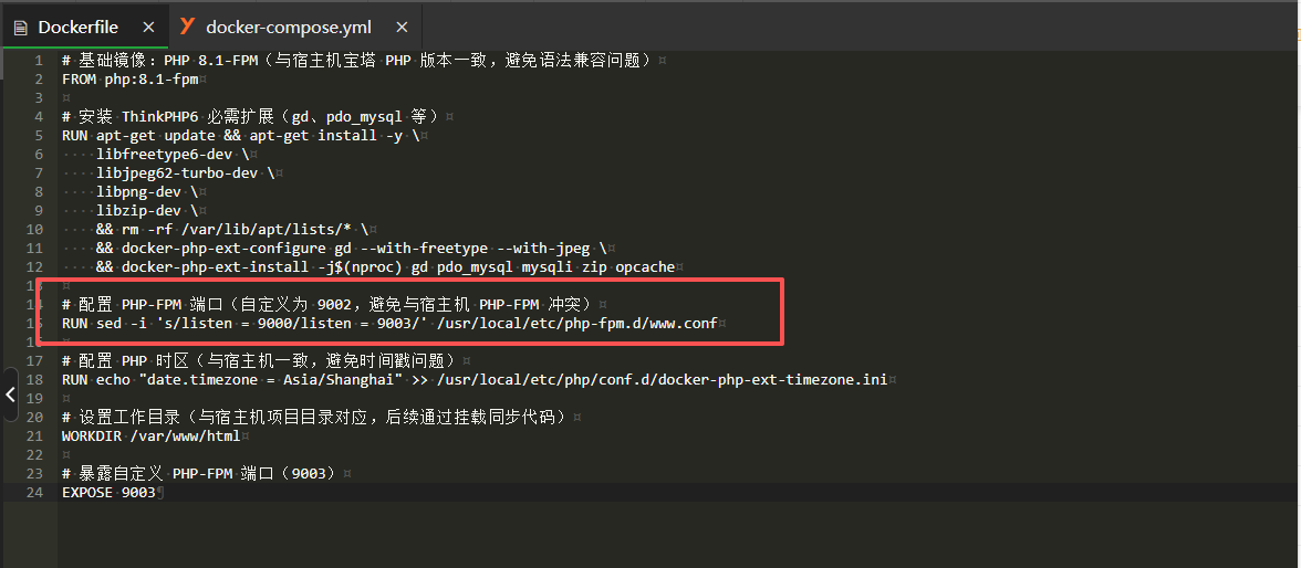 在我们的Docker中,有一段代码如下图红框中部分就是用来修改 PHP-FPM 的监听端口,从默认的 9000 端口改为 9003 端口。