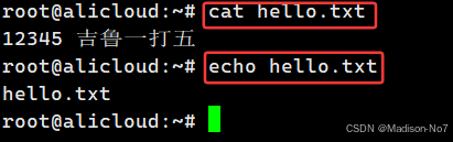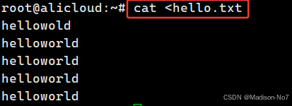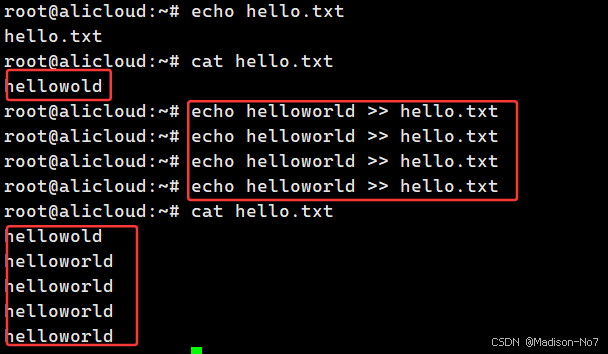 综上:我们可以知道helloworld这段字符是被写入到了hello.txt的文件中,而没有写入到显示器文件,意思就相当于改变了这段字符的去向,原本是应该去到显示器文件里的,就能显示在屏幕上,但是这里用>做了重定向,让它去到了hello.txt这个文件中。所以我们把这样的操作叫做输出重定向。
