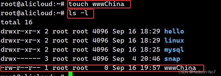 新建一个"wwwChina"普通文件。新建好了,ls -l查看有没有。