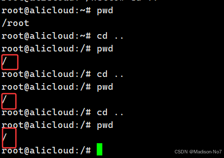 从上面可以看出,cd ..的功能是退回到上级目录。当然也不是能够一直回退的,但回退到只剩/时就不能回退了。