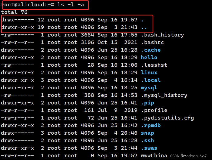 大家可以观察到,有两个目录的名称是 . 和 .. ,实际上,对于任何一个目录,即便是一个空目录,默认系统都会自带.和..目录。.表示当前目录,..表示上级目录。