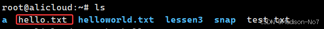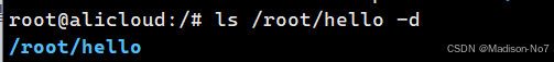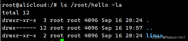单输入ls指令,默认只会显示当前文件下的文件名属性,"hello linux"就在其中。