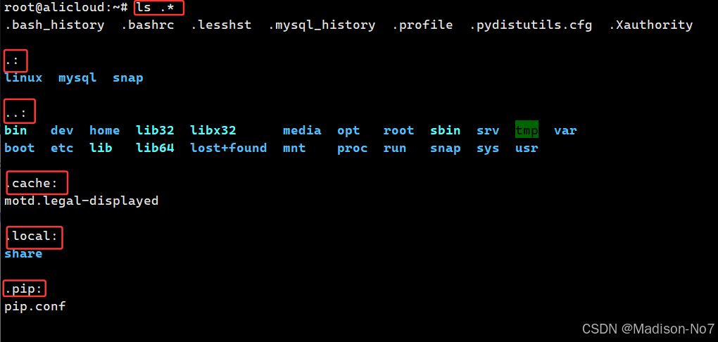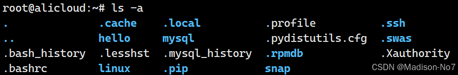 大家可以看到,上图中有很多文件以.开头,注意:以.开头的文件为隐藏文件,如果ls指令后面不加-a,就看到隐藏文件。