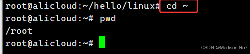 cd ~ 回到家目录,家目录就是任何一个linux用户,用特定的用户名登录上,默认在家目录下。