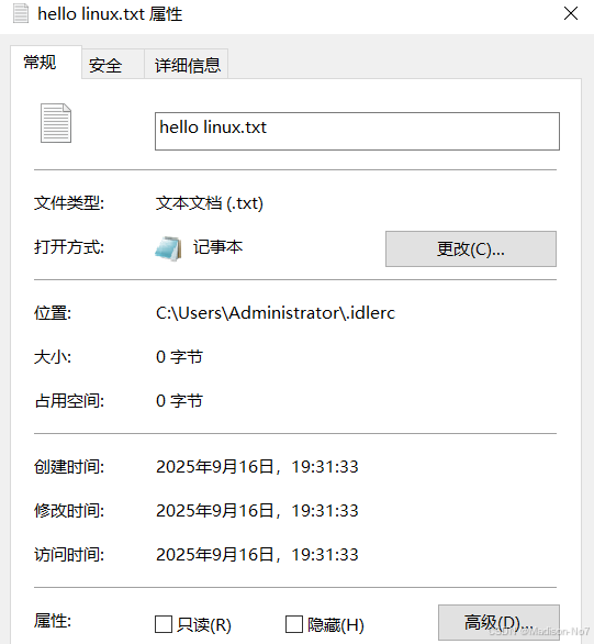 在Linux中系统中,一切皆文件,文件分为两种,第一种目录 相当于windows中的文件夹,第二种是文件 ,它是文件内容+文件属性,文件属性就是文件名、文件的位置、大小、创建时间、修改时间等等,属性相当于就是文件的身份证和定位器一样。就算是空文件也要占据磁盘空间。就比如我们在windows系统下,新建一个文本文件,即使我们什么也不写,我们也能把它保存在一个文件夹下,也能通过路径找到它。