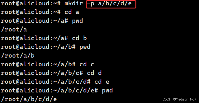 mkdir -p a/b/c/d/e 创建一串目录结构