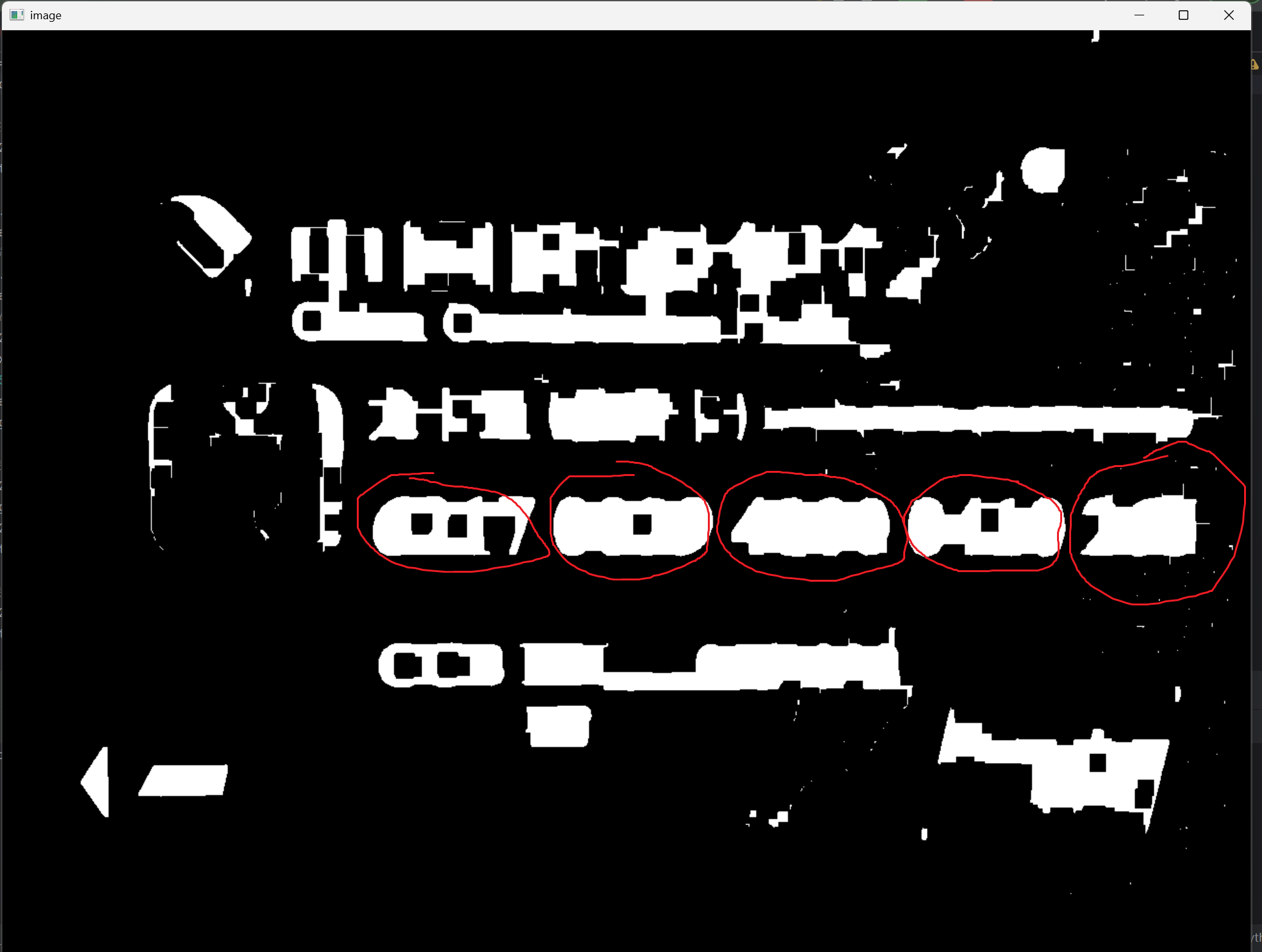 其中画上红圈的就是我们要找的卡号的位置,也是我们需要注意的区域。首先观察相邻数字是否连接,即红圈部分是否连成一块了,若是没有就需要加大参数尺寸;再看数字块之间是否连接,及相邻红圈是否连接,若是连接则需减小尺寸。若是调整之后还是无法做到上图的样子,或许可以调整图片来源。