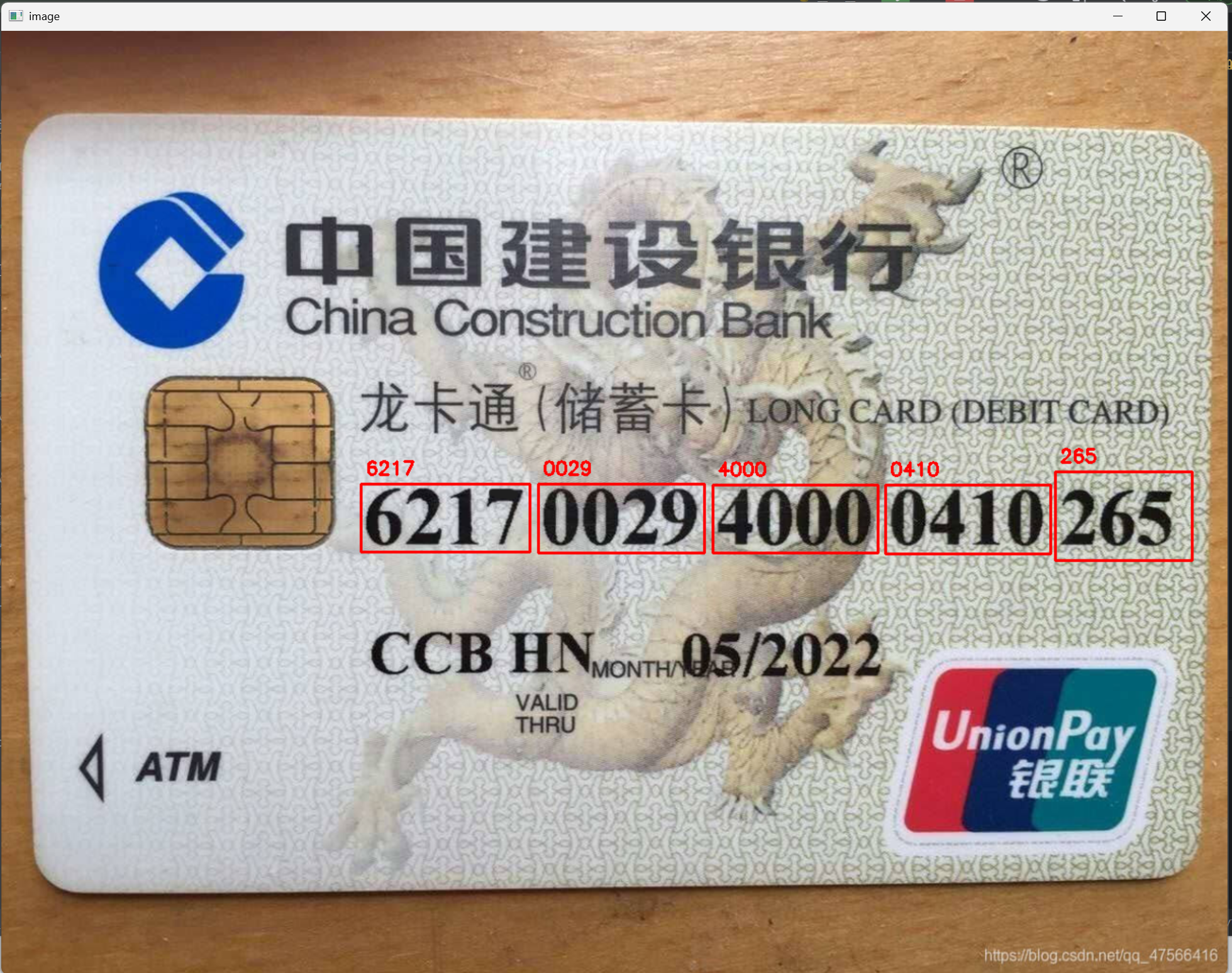 本项目综合使用了python语言OpenCV框架的各个处理手段,以达到从图片银行卡中识别出卡号的目的,结果图如下: